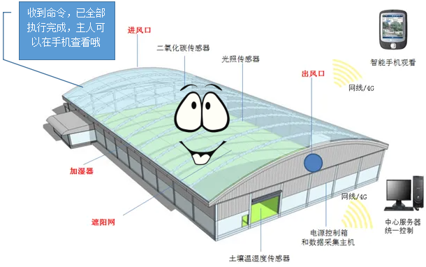 光照傳感器等等傳感器感知水分、溫度、濕度、二氧化碳等環(huán)境情況,物聯(lián)網(wǎng)把這些數(shù)據(jù)傳輸?shù)街腔坜r(nóng)業(yè)平臺,平臺根據(jù)我們自己設(shè)定的條件數(shù)據(jù)再去控制大棚的應(yīng)用設(shè)置,比如水分少就控制打開灌溉系統(tǒng),溫度高于多少度就自動打開遮陽被、打開通風(fēng)進行降溫等等: