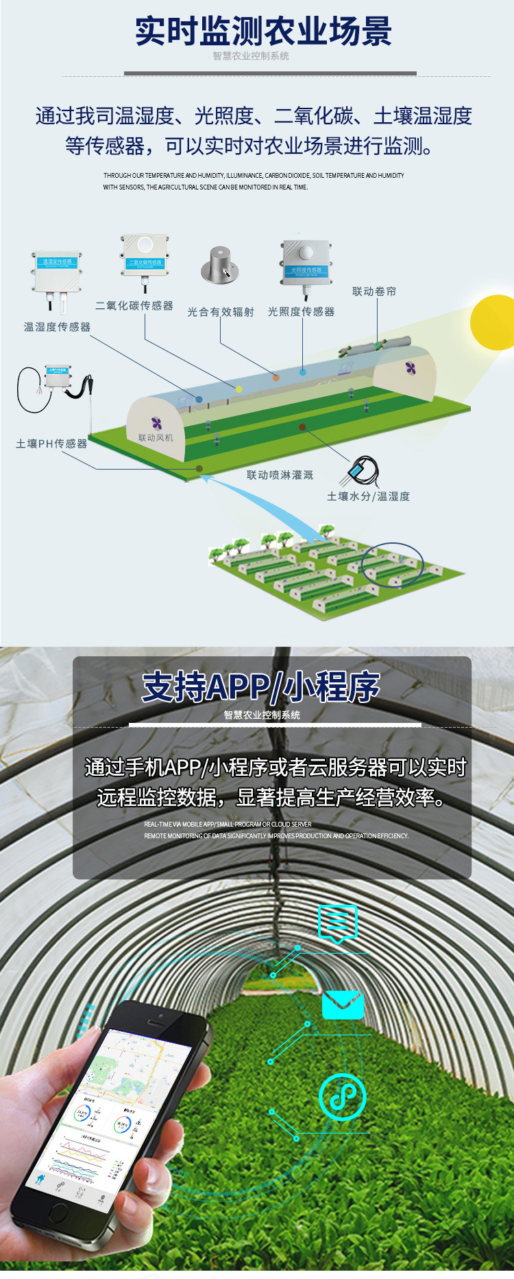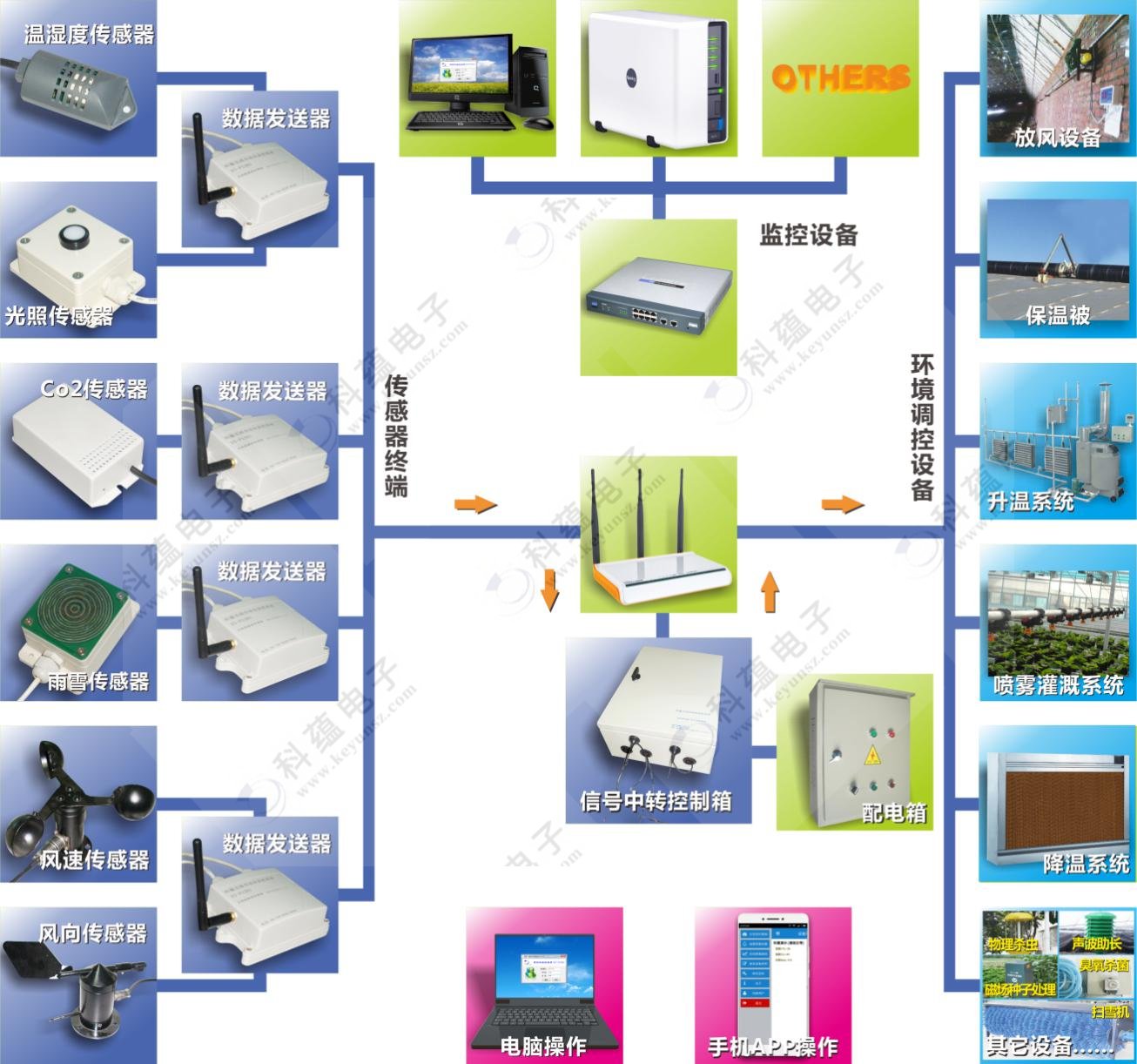 依托傳感器終端如溫度濕度傳感器、光照傳感器、土壤溫濕度、CO2傳感器、雨雪傳感器、風速傳感器、風向傳感器等,將信息采集發(fā)送到信號采集系統(tǒng),信號采集系統(tǒng)再通過云發(fā)送信息到電腦、手機端,通過電腦、手機端就可以直接對各環(huán)境調(diào)控設(shè)備如通風系統(tǒng)、遮陽保暖系統(tǒng)、升溫系統(tǒng)、降溫系統(tǒng)、噴霧灌溉系統(tǒng)、降濕系統(tǒng)或其它設(shè)備等進行調(diào)控。